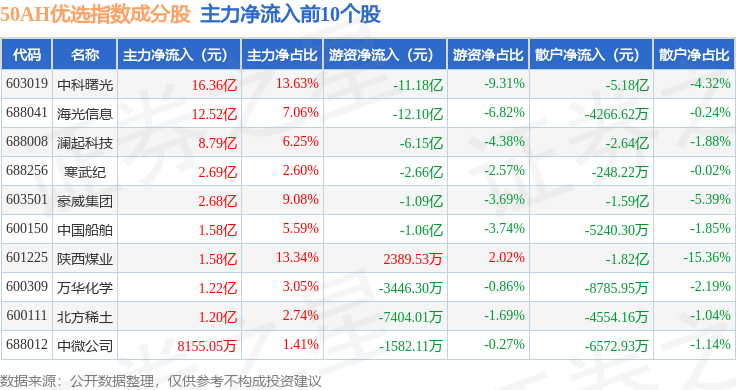 资金流向方面,50AH优选(000170)指数成份股当日主力资金净流入合计24.4亿元,游资资金净流出合计30.47亿元,散户资金净流入合计6.06亿元。成份股资金流向详情见下表: