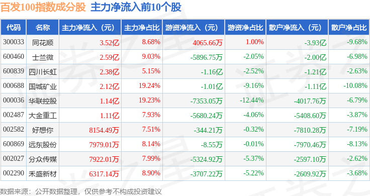 资金流向方面,百发100(000851)指数成份股当日主力资金净流出合计56.64万元,游资资金净流出合计2.87亿元,散户资金净流入合计2.88亿元。成份股资金流向详情见下表: