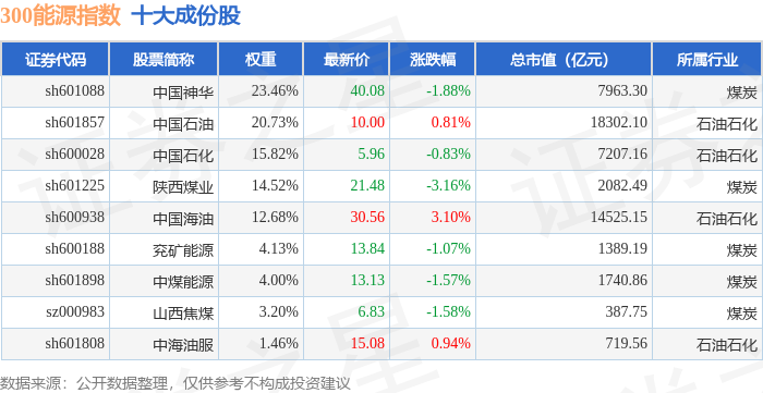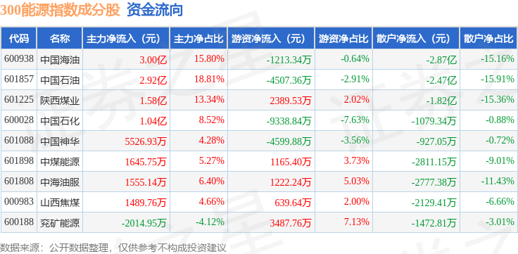 资金流向方面,300能源(000908)指数成份股当日主力资金净流入合计9.36亿元,游资资金净流出合计1.08亿元,散户资金净流出合计8.28亿元。成份股资金流向详情见下表: