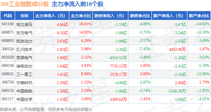 资金流向方面,300工业(000910)指数成份股当日主力资金净流出合计7.65亿元,游资资金净流入合计7241.72万元,散户资金净流入合计6.92亿元。成份股资金流向详情见下表: