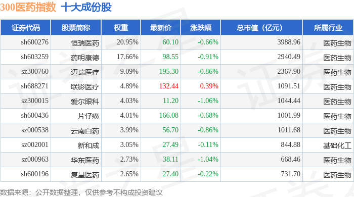 300医药(000913)指数十大成份股详情如下: