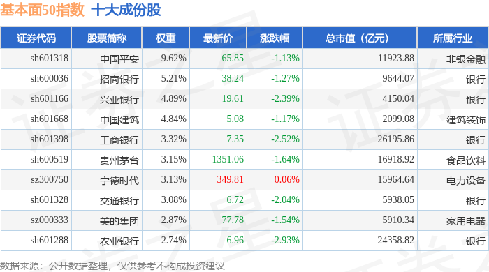 基本面50(000925)指数十大成份股详情如下: