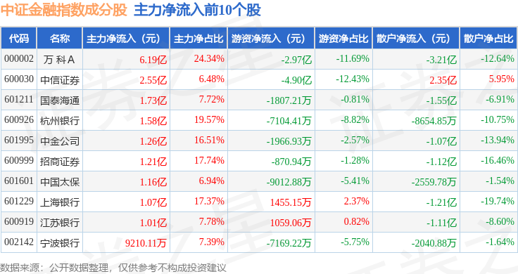 资金流向方面,中证金融(000934)指数成份股当日主力资金净流出合计11.62亿元,游资资金净流出合计6.5亿元,散户资金净流入合计18.12亿元。成份股资金流向详情见下表: