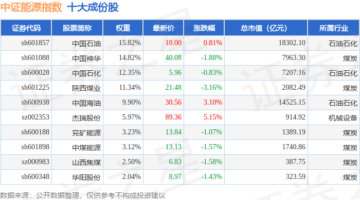 证券之星消息,1月21日,中证能源(000928)指数报收于3019.09点,跌0.08%,成交144.32亿元,换手率0.37%。当日该指数成份股中,上涨的有10家,杰瑞股份以5.15%的涨幅领涨,下跌的有13家,陕西煤业以3.16%的跌幅领跌。
