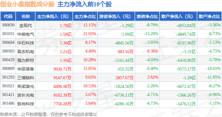 资金流向方面,创业小盘(399020)指数成份股当日主力资金净流出合计18.91亿元,游资资金净流出合计10.96亿元,散户资金净流入合计29.87亿元。成份股资金流向详情见下表: