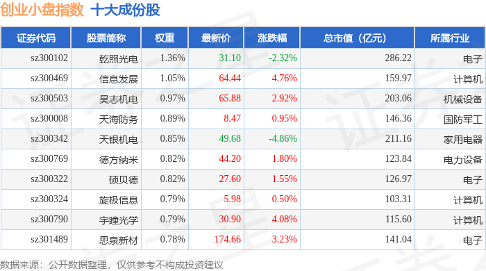 创业小盘(399020)指数十大成份股详情如下: