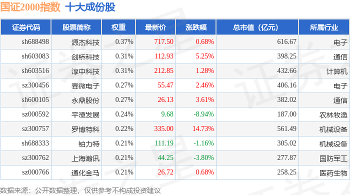 国证2000(399303)指数十大成份股详情如下: