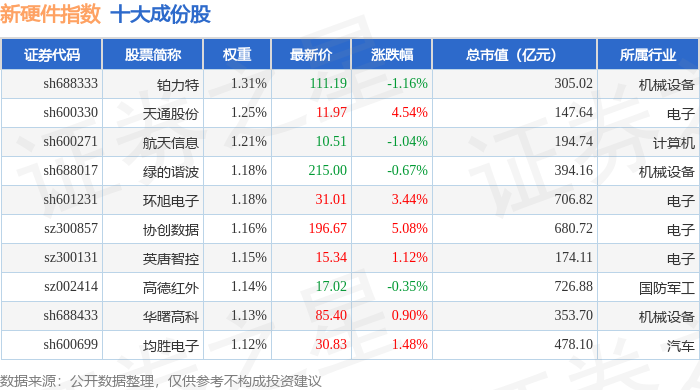 证券之星消息,1月21日,新硬件(399360)指数报收于8444.49点,涨1.29%,成交1635.05亿元,换手率3.11%。当日该指数成份股中,上涨的有67家,华天科技以10.01%的涨幅领涨,下跌的有33家,威胜信息以2.92%的跌幅领跌。