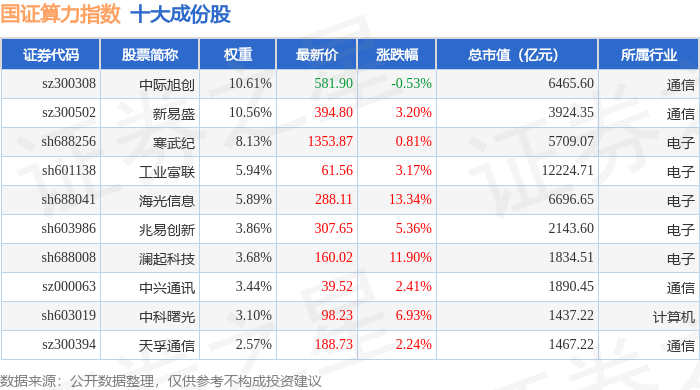 国证算力(399363)指数十大成份股详情如下:
