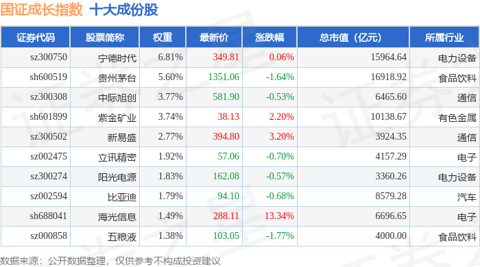 国证成长(399370)指数十大成份股详情如下: