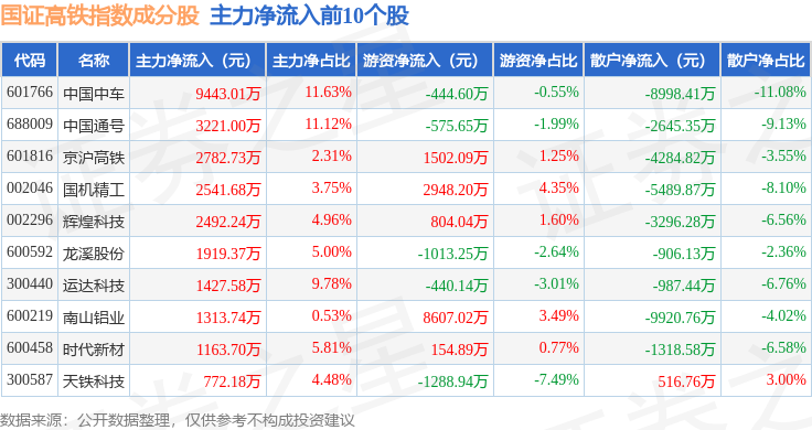 资金流向方面,国证高铁(399419)指数成份股当日主力资金净流出合计3.77亿元,游资资金净流入合计2.72亿元,散户资金净流入合计8302.97万元。成份股资金流向详情见下表: