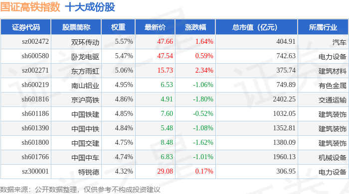 证券之星消息,1月21日,国证高铁(399419)指数报收于2268.38点,涨0.04%,成交213.34亿元,换手率1.09%。当日该指数成份股中,上涨的有28家,辉煌科技以3.46%的涨幅领涨,下跌的有18家,雷尔伟以2.7%的跌幅领跌。