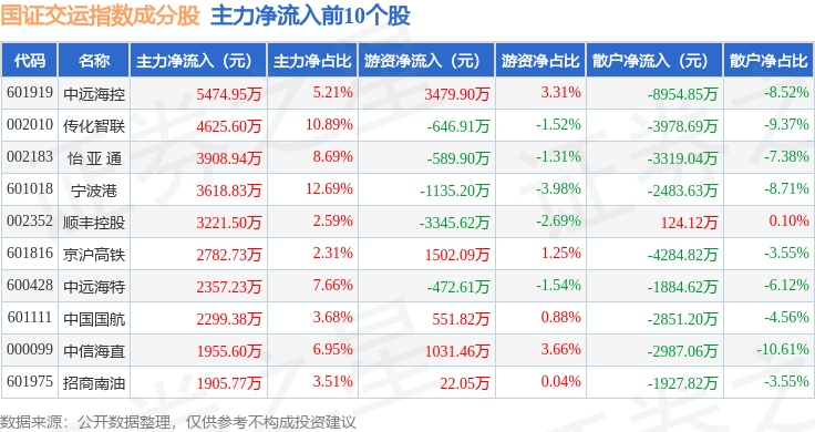 资金流向方面,国证交运(399433)指数成份股当日主力资金净流出合计2.93亿元,游资资金净流入合计4.67亿元,散户资金净流出合计1.74亿元。成份股资金流向详情见下表: