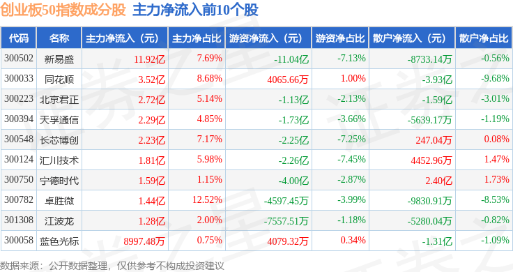 资金流向方面,创业板50(399673)指数成份股当日主力资金净流出合计26.1亿元,游资资金净流出合计10.91亿元,散户资金净流入合计37.01亿元。成份股资金流向详情见下表: