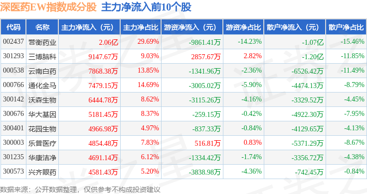 资金流向方面,深医药EW(399676)指数成份股当日主力资金净流出合计2396.71万元,游资资金净流入合计3.62亿元,散户资金净流出合计3.38亿元。成份股资金流向详情见下表: