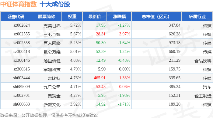 证券之星消息,1月21日,中证体育(399804)指数报收于2188.67点,涨0.4%,成交196.3亿元,换手率3.76%。当日该指数成份股中,上涨的有24家,金陵体育以14.73%的涨幅领涨,下跌的有19家,电魂网络以3.76%的跌幅领跌。