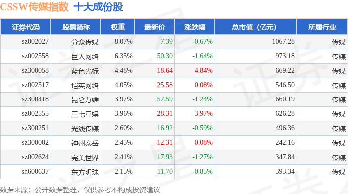 证券之星消息,1月21日,CSSW传媒(399810)指数报收于3529.22点,跌0.13%,成交802.94亿元,换手率4.63%。当日该指数成份股中,上涨的有27家,卓创资讯以5.4%的涨幅领涨,下跌的有65家,风语筑以9.81%的跌幅领跌。