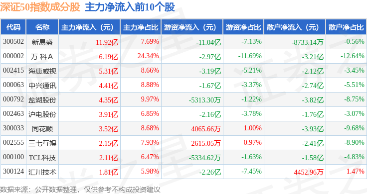 资金流向方面,深证50(399850)指数成份股当日主力资金净流入合计15.14亿元,游资资金净流出合计23.17亿元,散户资金净流入合计8.03亿元。成份股资金流向详情见下表: