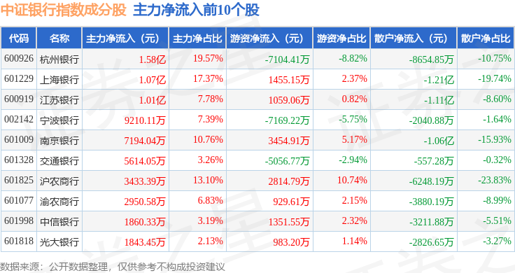 资金流向方面,中证银行(399986)指数成份股当日主力资金净流出合计7.93亿元,游资资金净流出合计2.51亿元,散户资金净流入合计10.44亿元。成份股资金流向详情见下表: