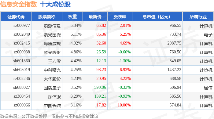信息安全(399994)指数十大成份股详情如下:
