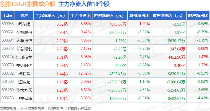 资金流向方面,创指ESGR(470028)指数成份股当日主力资金净流出合计35.05亿元,游资资金净流入合计3817.38万元,散户资金净流入合计34.67亿元。成份股资金流向详情见下表: