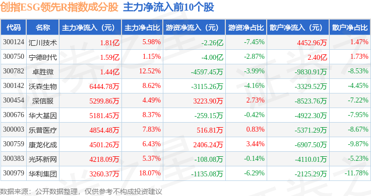 资金流向方面,创指ESG领先R(470031)指数成份股当日主力资金净流出合计41.32亿元,游资资金净流入合计6.84亿元,散户资金净流入合计34.47亿元。成份股资金流向详情见下表: