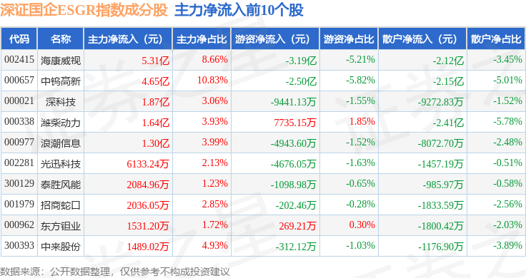 资金流向方面,深证国企ESGR(470055)指数成份股当日主力资金净流入合计2.65亿元,游资资金净流出合计5.32亿元,散户资金净流入合计2.67亿元。成份股资金流向详情见下表: