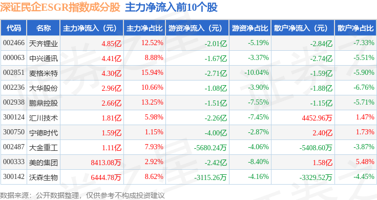 资金流向方面,深证民企ESGR(470056)指数成份股当日主力资金净流出合计6.65亿元,游资资金净流出合计18.04亿元,散户资金净流入合计24.69亿元。成份股资金流向详情见下表: