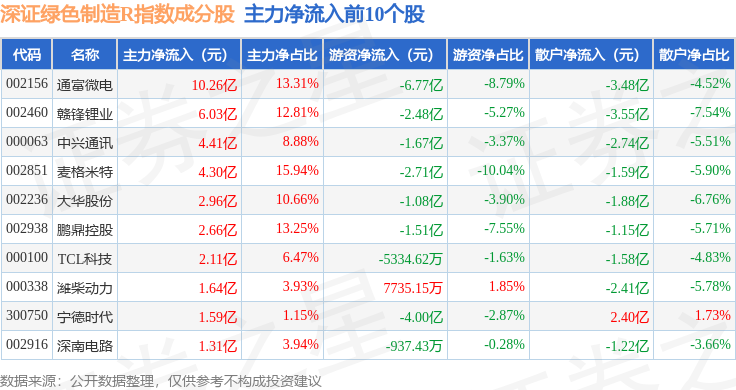 资金流向方面,深证绿色制造R(470069)指数成份股当日主力资金净流出合计8.96亿元,游资资金净流出合计21.5亿元,散户资金净流入合计30.46亿元。成份股资金流向详情见下表: