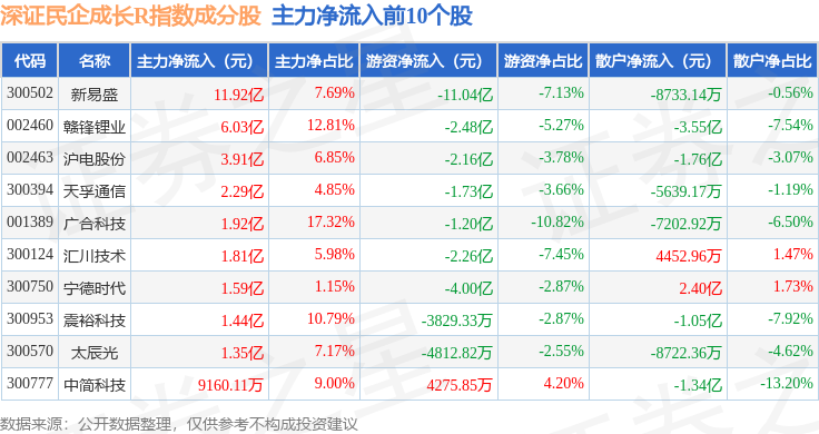 资金流向方面,深证民企成长R(470071)指数成份股当日主力资金净流入合计3.99亿元,游资资金净流出合计21.24亿元,散户资金净流入合计17.24亿元。成份股资金流向详情见下表: