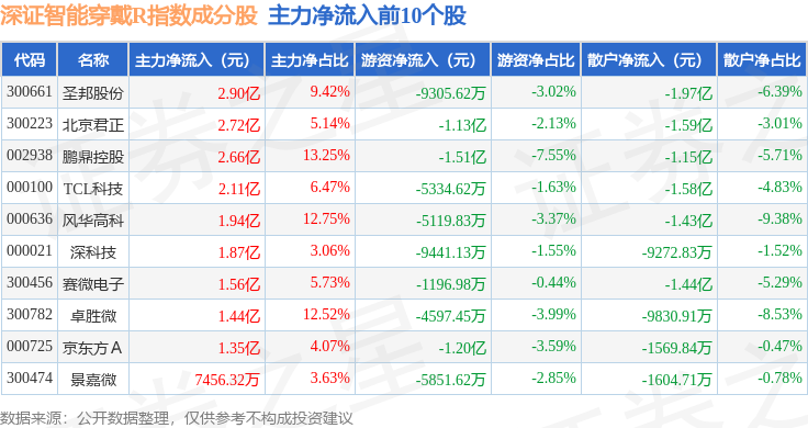 资金流向方面,深证智能穿戴R(470074)指数成份股当日主力资金净流出合计7.54亿元,游资资金净流出合计10.8亿元,散户资金净流入合计18.33亿元。成份股资金流向详情见下表: