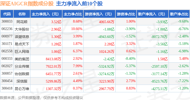 资金流向方面,深证AIGCR(470075)指数成份股当日主力资金净流出合计8.7亿元,游资资金净流入合计2.19亿元,散户资金净流入合计6.51亿元。成份股资金流向详情见下表: