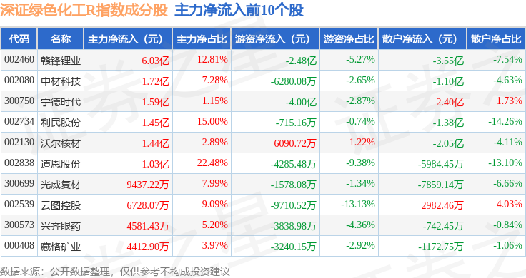 资金流向方面,深证绿色化工R(470076)指数成份股当日主力资金净流入合计11.78亿元,游资资金净流出合计10.01亿元,散户资金净流出合计1.78亿元。成份股资金流向详情见下表: