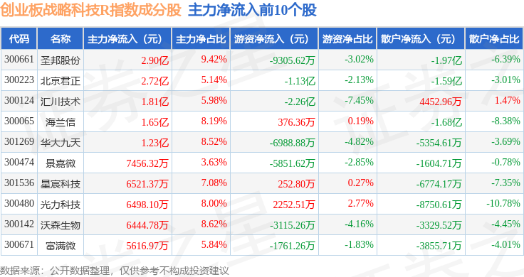 资金流向方面,创业板战略科技R(471004)指数成份股当日主力资金净流出合计1.09亿元,游资资金净流出合计4.99亿元,散户资金净流入合计6.08亿元。成份股资金流向详情见下表: