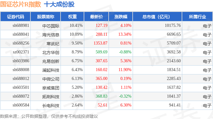证券之星消息,1月21日,国证芯片R(480017)指数报收于16425.65点,涨4.52%,成交1524.89亿元,换手率4.63%。当日该指数成份股中,上涨的有27家,龙芯中科以20.0%的涨幅领涨,下跌的有3家,晶盛机电以2.12%的跌幅领跌。