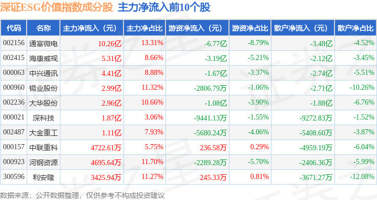 资金流向方面,深证ESG价值(970061)指数成份股当日主力资金净流出合计2.99亿元,游资资金净流出合计12.92亿元,散户资金净流入合计15.91亿元。成份股资金流向详情见下表: