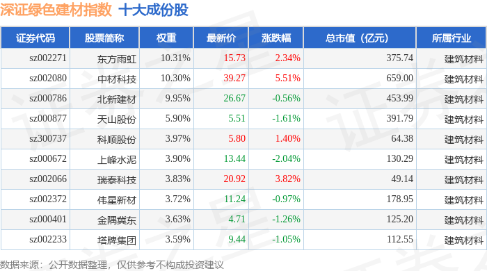 证券之星消息,1月21日,深证绿色建材(970077)指数报收于1473.79点,涨1.1%,成交106.67亿元,换手率2.64%。当日该指数成份股中,上涨的有15家,国际复材以9.58%的涨幅领涨,下跌的有14家,青龙管业以2.4%的跌幅领跌。
