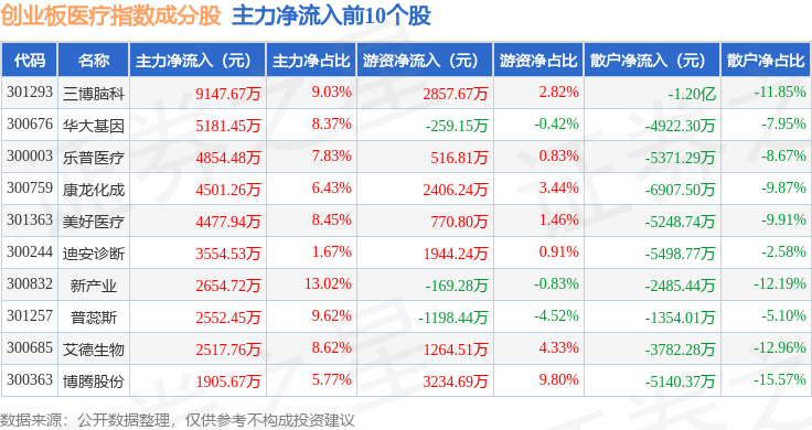 资金流向方面,创业板医疗(970082)指数成份股当日主力资金净流入合计1.32亿元,游资资金净流入合计1.69亿元,散户资金净流出合计3.01亿元。成份股资金流向详情见下表: