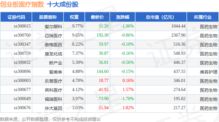 证券之星消息,1月21日,创业板医疗(970082)指数报收于3959.6点,涨0.1%,成交163.2亿元,换手率2.03%。当日该指数成份股中,上涨的有28家,迪安诊断以5.59%的涨幅领涨,下跌的有21家,泓博医药以1.88%的跌幅领跌。