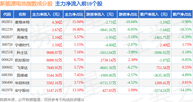 资金流向方面,新能源电池(980027)指数成份股当日主力资金净流入合计5.05亿元,游资资金净流出合计13.32亿元,散户资金净流入合计8.27亿元。成份股资金流向详情见下表: