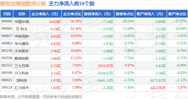 资金流向方面,绿色治理(980058)指数成份股当日主力资金净流入合计7499.38万元,游资资金净流出合计29.16亿元,散户资金净流入合计28.41亿元。成份股资金流向详情见下表: