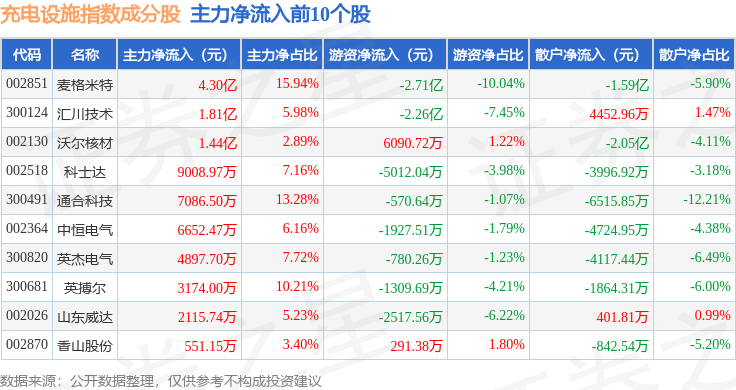 资金流向方面,充电设施(980077)指数成份股当日主力资金净流出合计6.22亿元,游资资金净流出合计3.57亿元,散户资金净流入合计9.75亿元。成份股资金流向详情见下表: