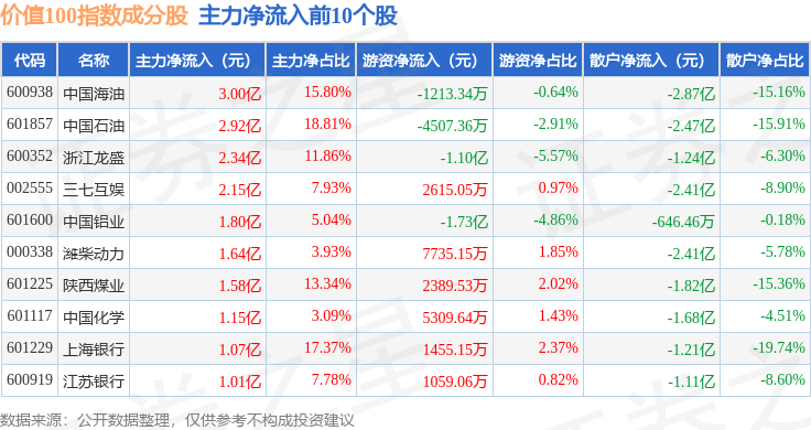 资金流向方面,价值100(980081)指数成份股当日主力资金净流入合计17.68亿元,游资资金净流出合计3.97亿元,散户资金净流出合计13.71亿元。成份股资金流向详情见下表: