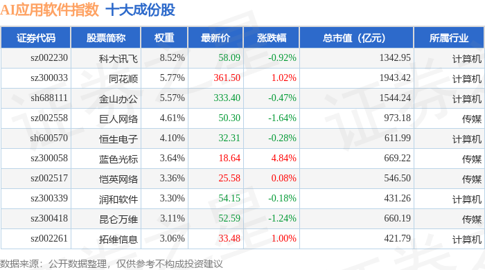 AI应用软件(980107)指数十大成份股详情如下: