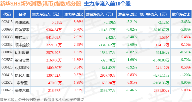 资金流向方面,新华SHS新兴消费(港币)(989007)指数成份股当日主力资金净流出合计2.42亿元,游资资金净流出合计4.94亿元,散户资金净流入合计7.36亿元。成份股资金流向详情见下表: