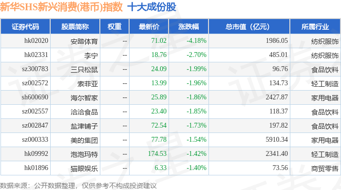新华SHS新兴消费(港币)(989007)指数十大成份股详情如下: