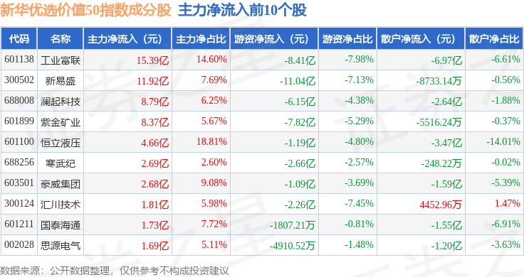 资金流向方面,新华优选价值50(989004)指数成份股当日主力资金净流入合计14.14亿元,游资资金净流出合计25.74亿元,散户资金净流入合计11.6亿元。成份股资金流向详情见下表: