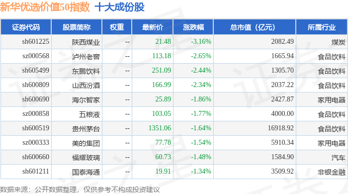 新华优选价值50(989004)指数十大成份股详情如下: