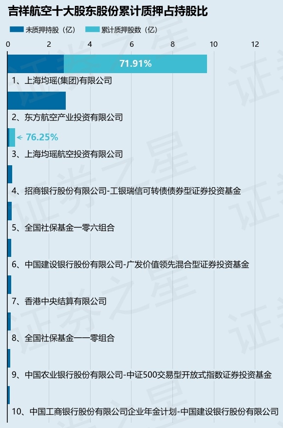 截止本公告日,股东上海均瑶(集团)有限公司已累计质押股份6.96亿股,占其持股总数的71.91%,股东上海均瑶航空投资有限公司已累计质押股份2750.0万股,占其持股总数的76.25%。本次质押后吉祥航空十大股东的累计质押股份占持股比例(占持股比例的计算以公司最新一期财务报表公布的十大股东的持股总数为基准)见下图: