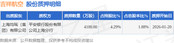 证券之星消息,吉祥航空(603885)1月21日公开信息显示,股东上海均瑶(集团)有限公司向平安银行股份有限公司上海分行合计质押4100.0万股,占总股本1.88%。质押详情见下表: